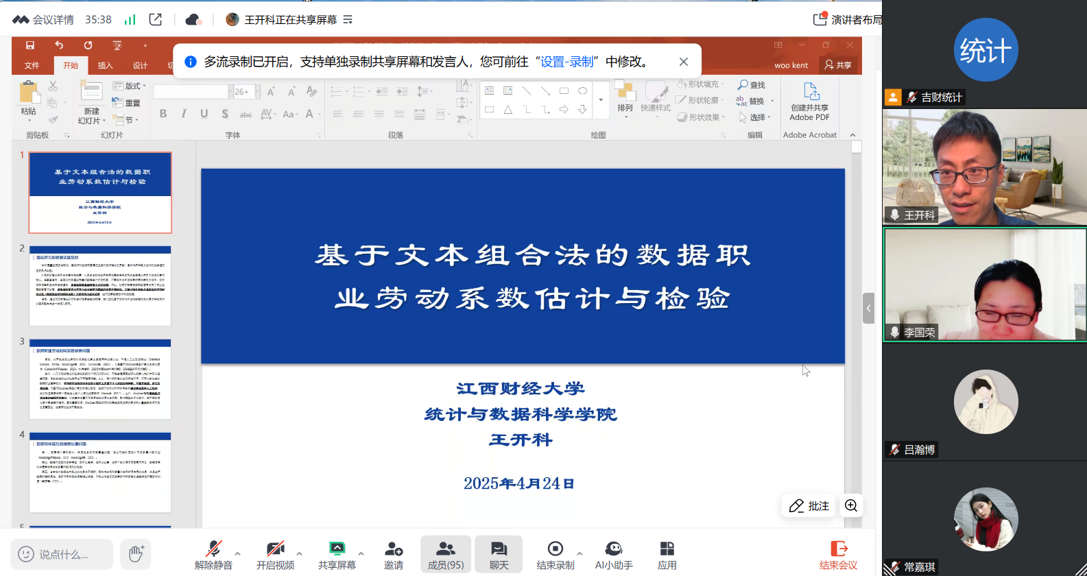 4月24日,海角视频 邀请江西财经大学统计与数据科学学院王开科教授作题为“基于文本组合法的数据职业劳动系数估计与检验”的线上报告。王开科以数据要素价值核算为出发点,阐述了在数据职业劳动系数测算领域的探索性研究。他指出,为解决传统统计方法难以精准捕捉数据生产活动的复杂性,构建了基于《中华人民共和国职业分类大典》的文本组合术语词典,形成覆盖数据采集、处理、分析全链条的标准化术语体系。进一步对比三种技术路...