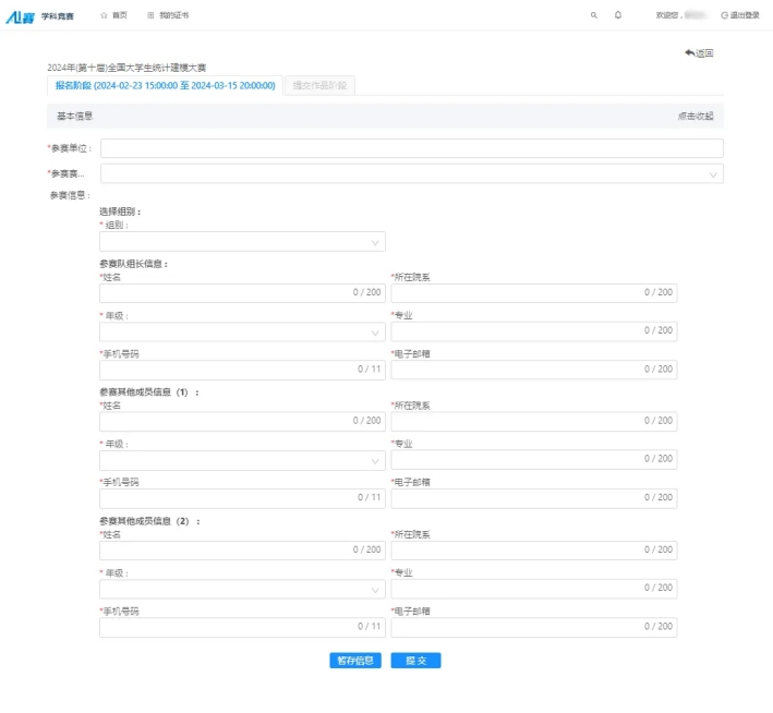 3.参赛信息:组别(选择对应的“本科生组”或“研究生组”);参赛队长、组员信息(姓名、所在院系、年级、专业、手机号码、邮箱)。以上信息均为必填项,需在3月15日20:00前填好并点击“提交”按钮进行报名。