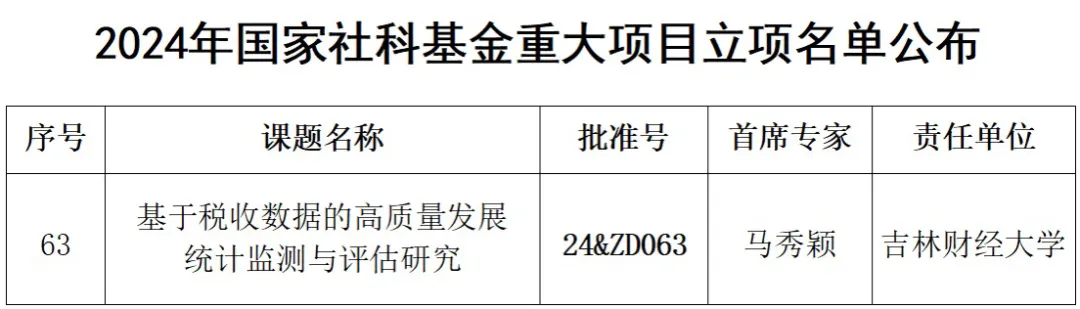 近日,2024年度国家社科基金重大项目立项名单公布,海角视频 马秀颖教授担任首席专家的项目《基于税收数据的高质量发展统计监测与评估研究》获批立项。