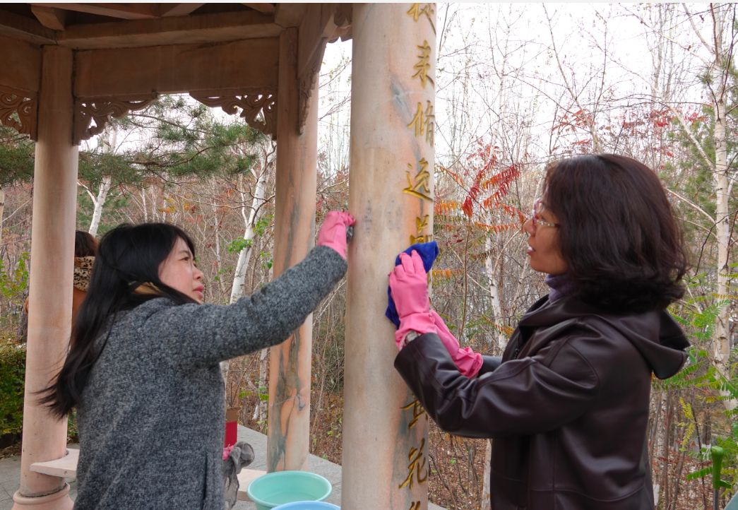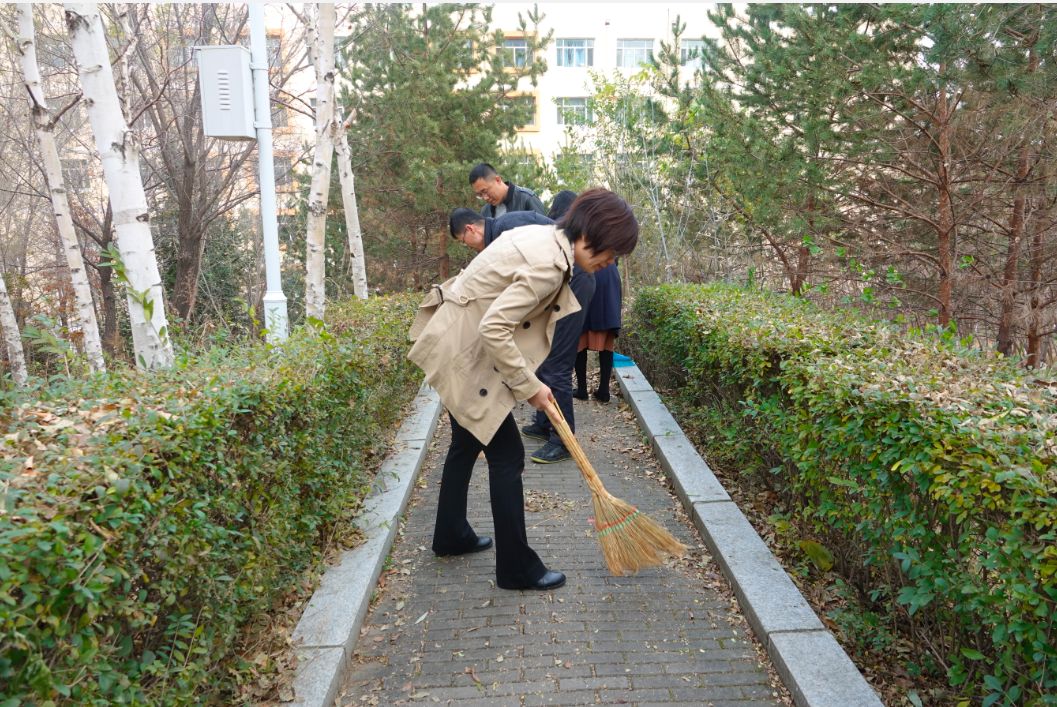 马秀颖同志和王士香同志带领一部分党员清理隅山亭石柱上的一些小广告,曲晓东同志和孙成伟同志以及其他党员们手拿扫帚等清洁工具,积极主动地清扫落叶和隅山亭林荫小道上的垃圾,在党员们仔细地清扫下,隅山亭焕然一新,通往隅山亭的小道重现了它之前的整洁和宁静。党员们认真地清扫隅山亭的每一个角落,满怀热情地办实事,力求完美,以劳为荣,更分地展现了中共党员的责任和精神风貌。