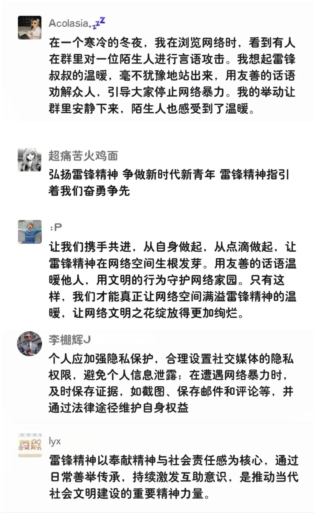 此次“网络文明”学雷锋志愿服务活动,引领同学们深入体悟了雷锋无私奉献、助人为乐的精神内核,唤醒了内心的社会责任感和集体荣誉感。活动不仅是一次精神的升华,更激励着大家以雷锋为楷模,从细微之处践行大爱,传递温暖与正能量。网络文明建设任重道远,但只要我们每个人都能从点滴做起,网络空间一定会变得更加清朗、温暖。