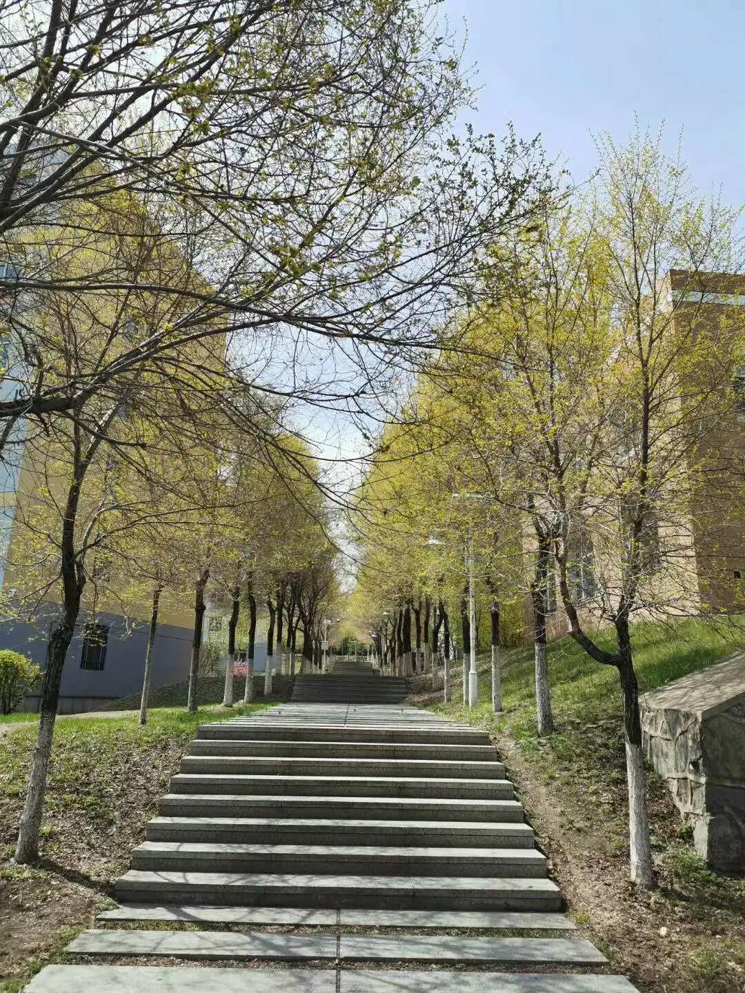 树枝在微风吹拂之下不停摇曳,通往食堂的小道嬉嬉闹闹,仰望蔚蓝的天空和小伙伴一起在红绿相间的操场上尽情畅聊,这才是吉林财经春日的校园生活!