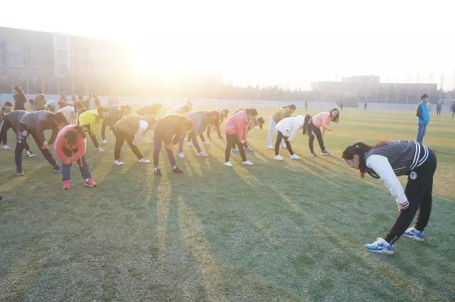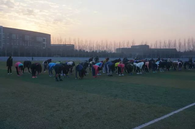 正式训练开始前,为了使大家身体更好的适应训练强度,大二学长、学姐带领大一运动员跑步热身,伸展身体。运动员们在操场上挥洒汗水,努力训练。虽然辛苦,但是他们还是坚持了下来。