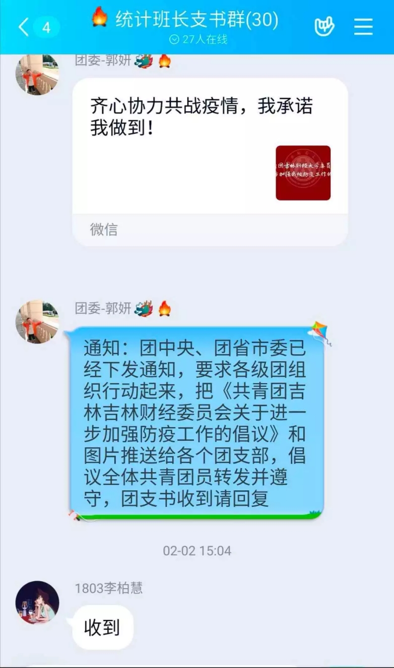 同呼吸共命运。顺境逆境看襟怀,大事难事看担当。新型冠状病毒感染的肺炎疫情防控工作的关键时期。海角视频 学生党支部将继续充分发挥党员的先锋模范作用,以积极心态面对疫情变化,学会适当使用心理支持与服务热线、向家人朋友倾诉等方式释放心理压力,提升心理健康水平,传导社会正能量,维护和谐的家庭人际关系。把做好疫情防控工作作为学院压倒一切的重大政治任务,带头落实防护措施,坚决打赢疫情防控阻击战役,不折不扣抓好各项任务落实。自觉肩负起时代赋予的使命和责任,做好“守护者”、“修行者”和“识途者”,积极为夺取战“疫”的胜利作出应有的贡献。