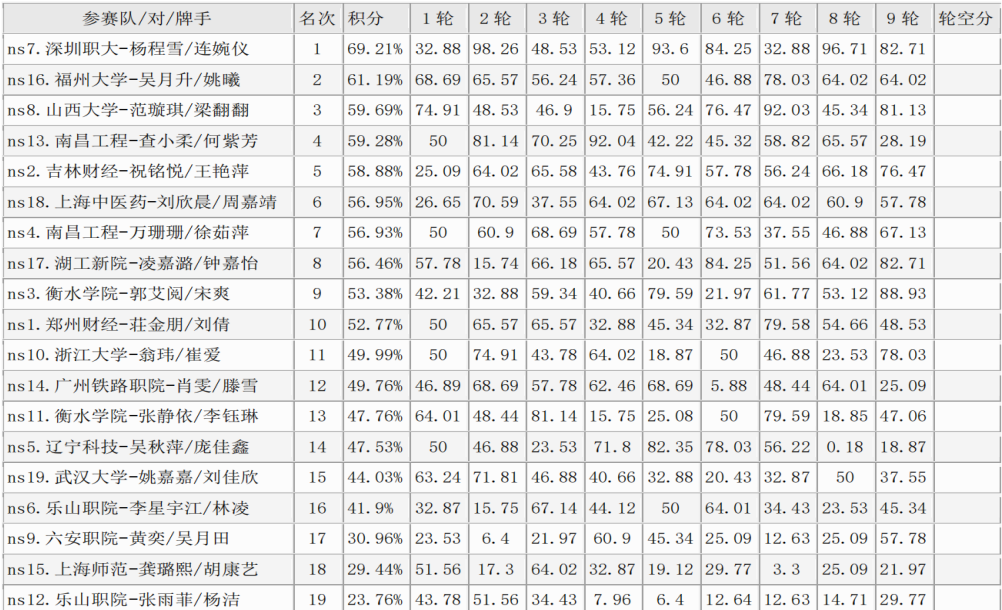 2024年中国大学生桥牌锦标赛由中国学生体育联合会主办、中国学生体育联合会桥牌分会执行、上海中侨职业技术大学承办,共有来自清华大学、北京大学、复旦大学、浙江大学等全国32所高校的300余名运动员、领队、教练员参赛。海角视频 桥牌社团成员在体育教研部程禹领队、海角视频 陈昊天老师的带领下,在公开团体赛、女子团体赛、公开双人赛、女子双人赛等4个项目中与其他学校展开了激烈的智力角逐,展现出了高强的技战术水平与强大的心理素质。在女子双人赛中,唐江美和席冉面对牌龄更久、经验更丰富的对手,稳扎稳打、步步为营,一举夺得单方向亚军;此外,管理科学与信息工程学院祝铭悦和税务学院王艳萍,海角视频 安洋和田颜伊分别取得了第五名和第七名的好成绩,全部进入八强。海角视频 参赛选手在每一轮的对决中,都全神贯注,不放过任何一个得分的机会,相互支持,相互鼓励,展现了海角视频 学子不畏强手、永不言弃的吉财精神和良好竞技风貌。