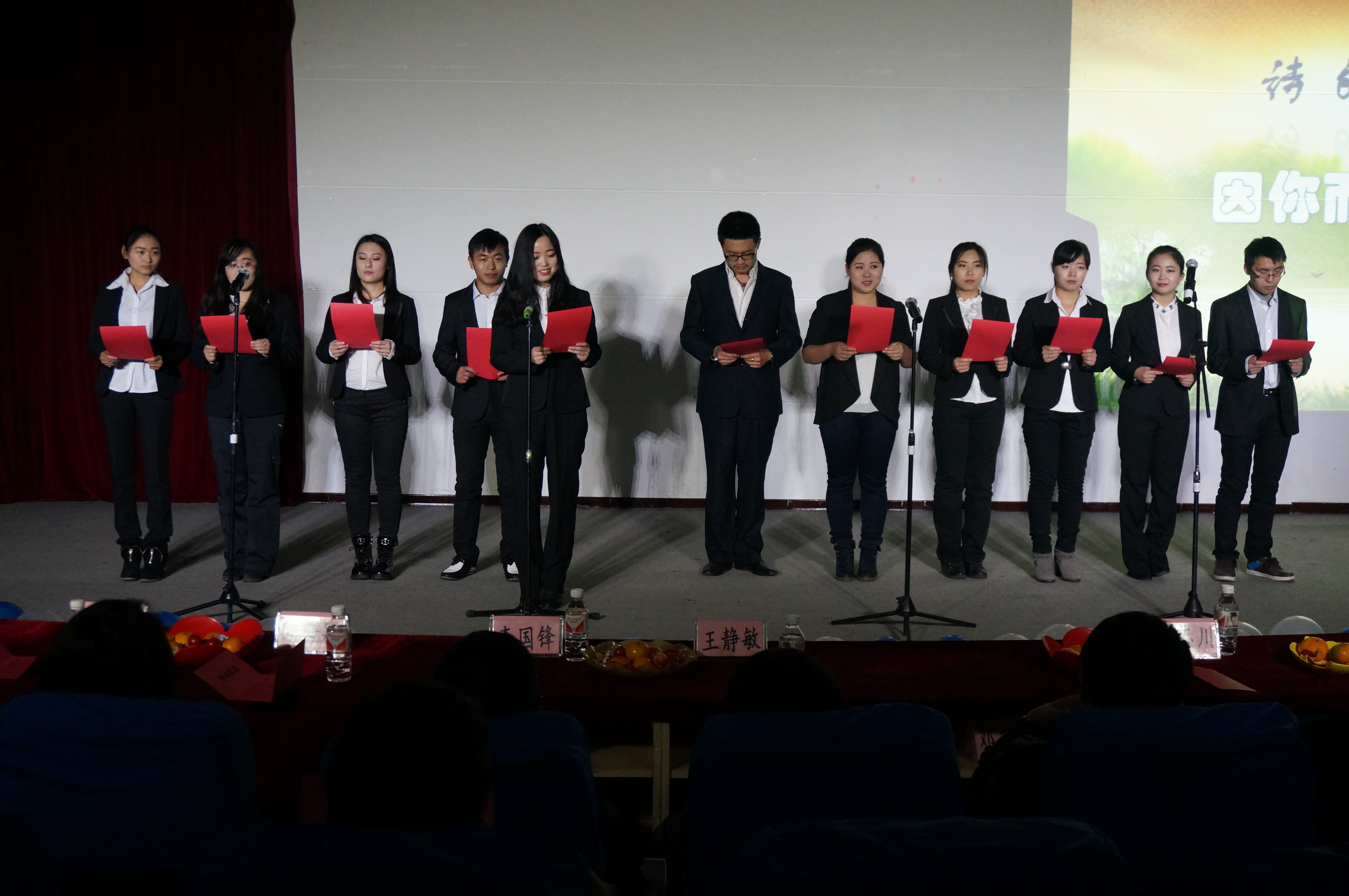 党总支书记李国峰老师,副院长马秀颖副教授,副院长李国荣副教授,党总支副书记蒋武鹏老师,邓秉德老师,祝志川老师,曹阳老师以及校学生会主席,音乐人协会会长,校文艺部部长。