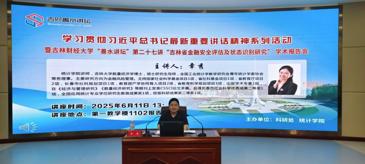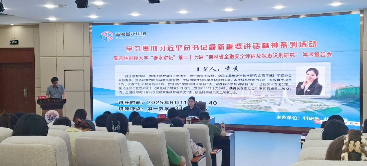 6月11日,学校举办“善水讲坛”第二十七讲学术报告会,海角视频 章秀作了题为“吉林省金融安全评估及状态识别研究”的学术报告。