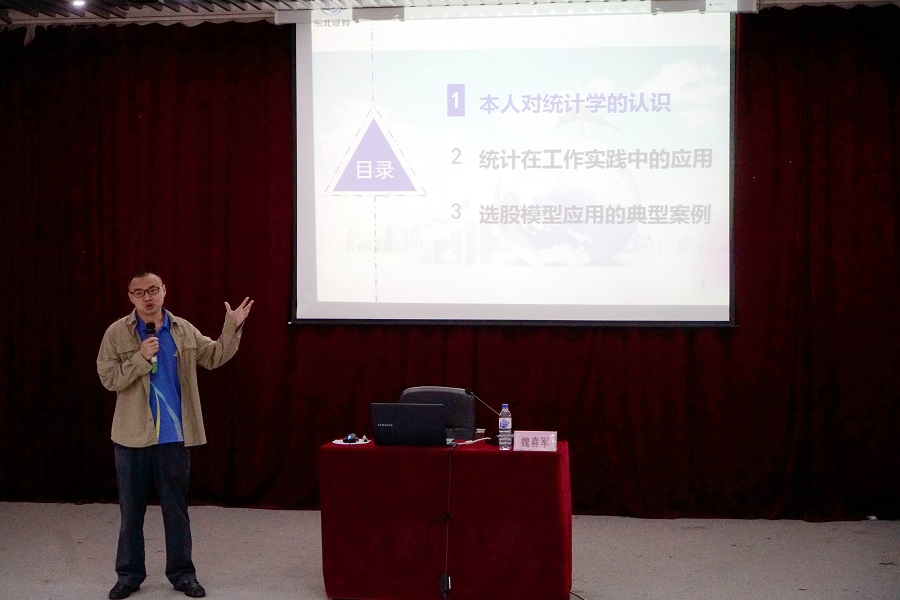 随后,魏喜军以自身行业为出发点进行了“统计在证券投资分析实践中的应用”的主题报告。他首先简要介绍了自己对于统计学的认知感悟;而后通过股价预测、分析体系及选股模式的建立为例,形象地介绍了统计模型在证券投资分析实践中的应用,并分析了选股模型应用的典型案例;最后,他通过软件演示的方式具体讲解了选股的成功案例,强调了数字在股票市场中的魅力,使在场师生对证券分析产生了极大兴趣。