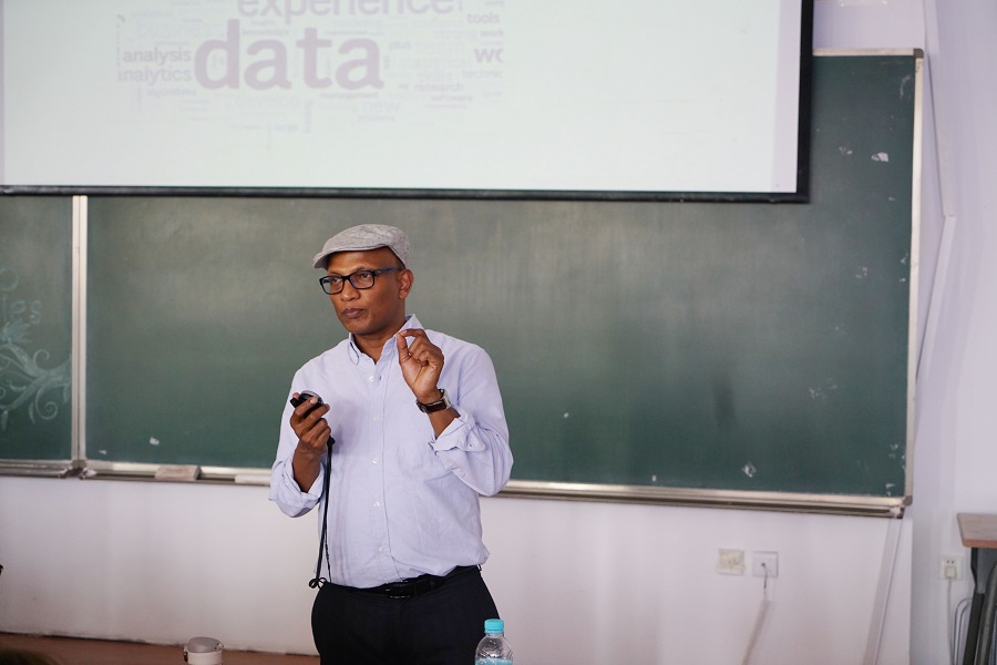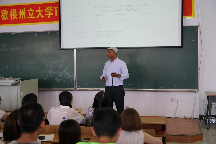 Tapabrata Maiti教授首先从学校设施、课外生活、学术研究、学科发展等方面介绍了美国密歇根州立大学的基本情况。然后他通过自身的经历和体会,向我们介绍了目前统计学科在美国的发展现状、未来前景,以及在经济、生物医学、金融、互联网等领域的广泛应用,他向我们展示了统计学科非常广阔的未来发展前景和最具魅力和吸引力的职业——大数据科学家。随后,他对成为一名大数据专业人才所需要的专业知识和技能,美国对这方面人才的选拔标准做出了介绍。Tapabrata Maiti教授还对海角视频 和美国密歇根州立大学之间的未来合作前景有着美好的期待,他希望有更多优秀学子去美国深造。最后,Tapabrata Maiti教授耐心解答了在场师生提出的每一问题。