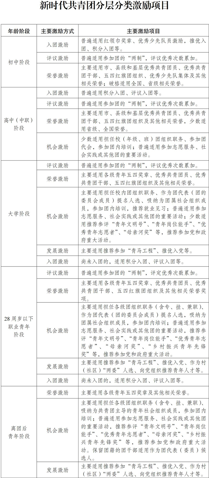 1.强化分层激励。深刻把握青少年成长的非线性特点,综合考虑不同年龄段青年的社会化程度,按照初中、高中(中职)、大学、职业青年团员、离团后青年等阶段分层实施,突出不同阶段激励重点(见附件)。