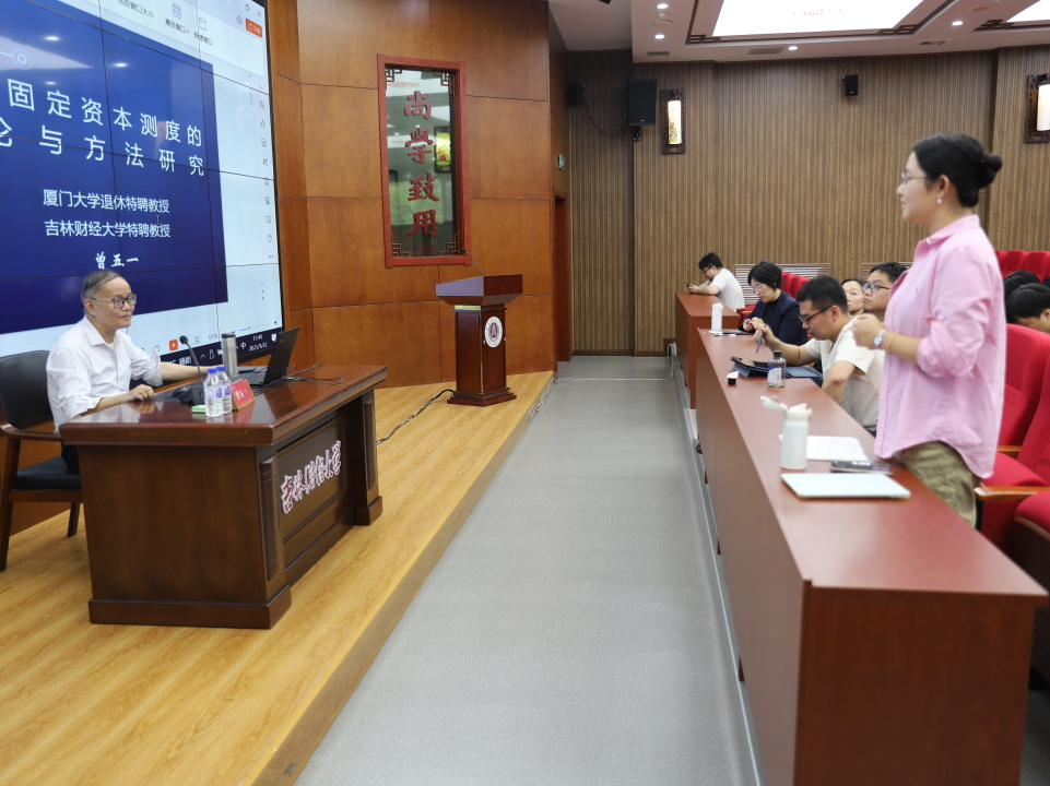 此次座谈围绕“学科前沿动态”“高水平科研项目申报与成果凝练”以及“教学实践创新与人才培养”等核心议题有序展开。曾教授与参会教师进行了深入交流。他分享了在国民经济核算,特别是资本核算领域的研究体会与前沿洞察,解答了青年教师在学术研究和教学实践过程中所遭遇的困惑,并具有针对性地提出诸多建设性意见与发展思路。曾教授深厚的学术素养与开阔的学术视野,为学院教师提升教学科研能力、优化本学科发展路径提供了极为宝贵的启示与参考。